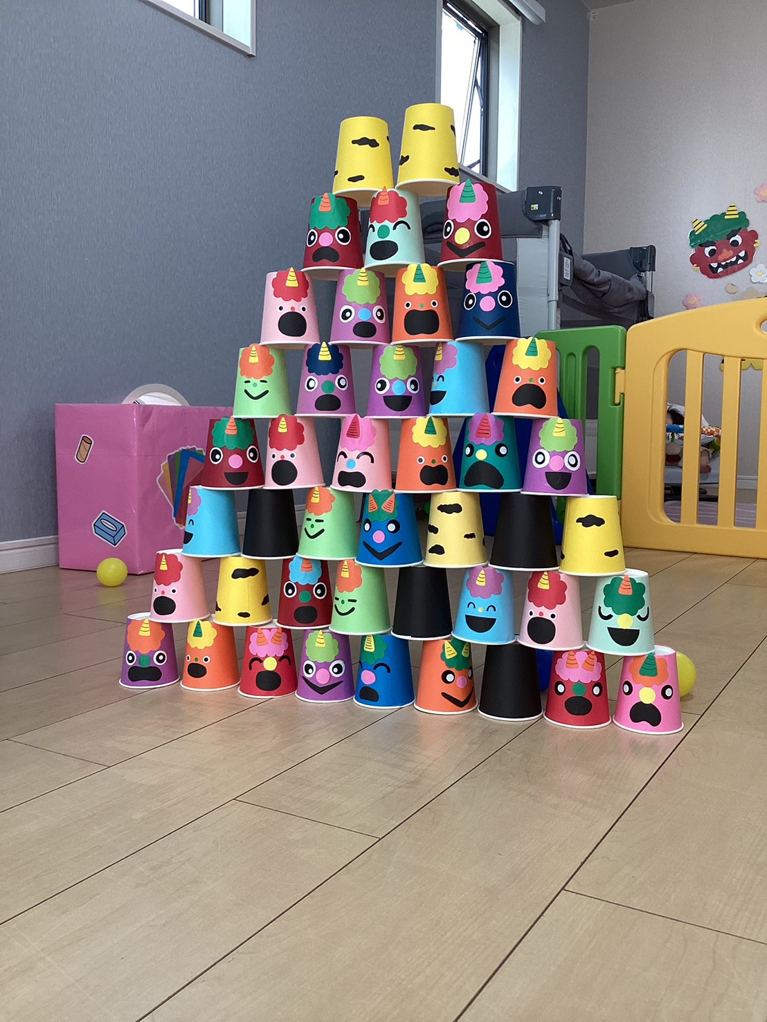 鬼を模した的を用意して、子ども達にボールを投げてもらい鬼退治!😁